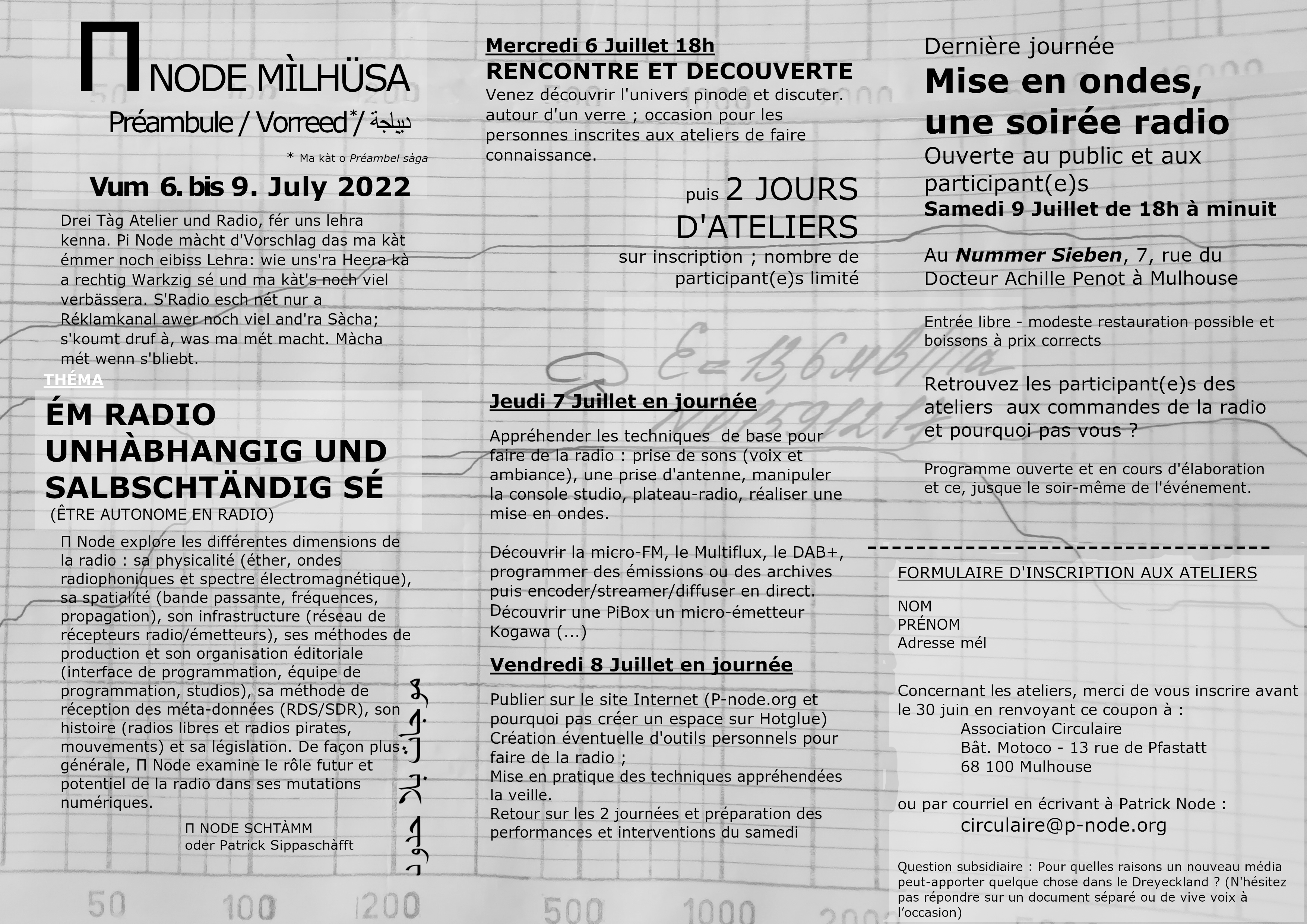 Drei Tàg Atelier und Radio, fér uns lehra kenna. Pi Node màcht d'Vorschlag das ma kàt émmer noch eibiss Lehra: wie uns'ra Heera kà a rechtig Warkzig sé und ma kàt's noch viel verbässera. S'Radio esch nét nur a Réklamkanal awer noch viel and'ra Sàcha; s'koumt druf à, was ma mét macht. Màcha mét wenn s'bliebt.