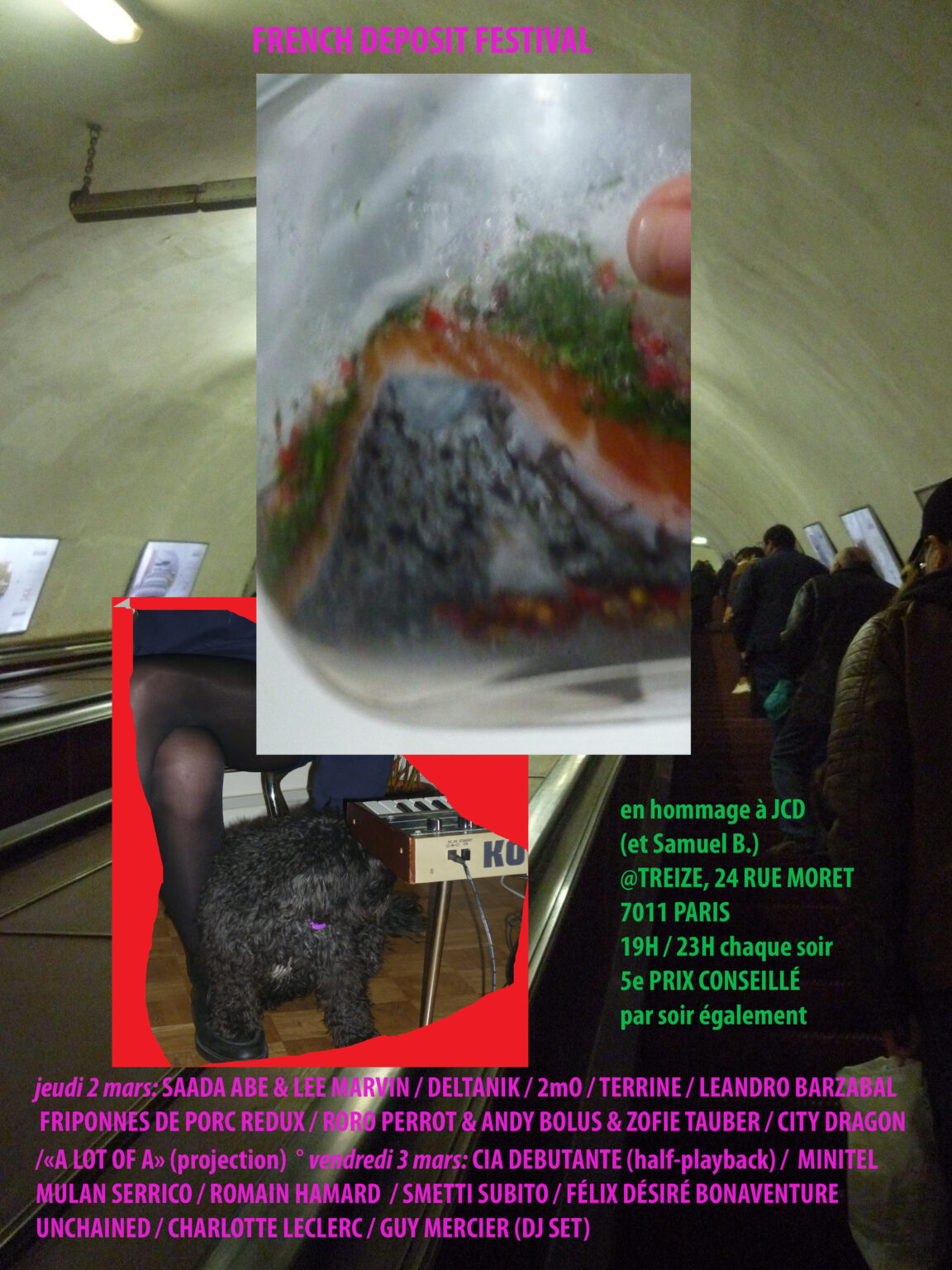 # Avis aux lectures et lectrices et aux auditeurs et auditrices potentiels de cette page Internet consacrée à la soirée du jeudi 2 mars du Festival FRENCH DEPOSIT PéNULTIèME organisée pour le souvenir de Jean-CHarles (CH) : _à partir de cette ligne_ vous ne trouverez aucun réalisme ou aucune correspondance avec le réel de la soirée de concerts - ou très peu - qui s'est tenue à la Galerie XIII (merci à eux). Si vous engagez votre attention, concentration plus bas vous ne pourrez vous en prendre qu'à vous-même. Ici il est essentiellement question de traces. Oui Laisser une trace. Pour le reste, faites comme d'habitude quand vous spéculez sur les relations internationales, laissez libre court à votre imagination ou à vos vagues souvenirs. HAsardez vous quand même, évitez d'en faire un sketch.