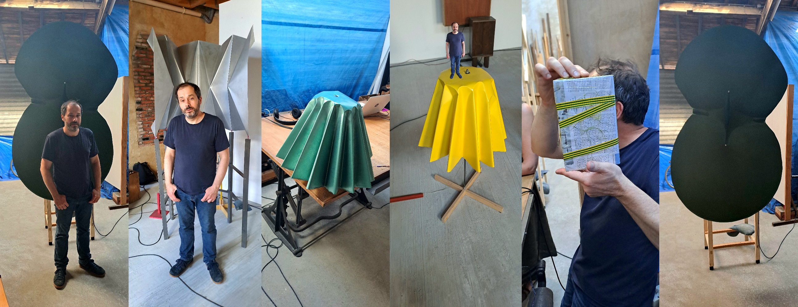 1' à 41' - Dans l'atelier de Yoann avec consultant et traductrice, interview de l'artiste, présentation des structures.