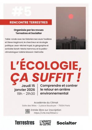 Table-ronde le jeudi 15 janvier 2026 avec la paléoclimatologue Valérie Masson-Delmotte, la géographe et activiste Sarah-Maria Hammou, les historien·nes Laure Teulières et Steve Hagimont et le chercheur en écologie politique Jean-Michel Hupé. Une rencontre organisée par Terrestres en partenariat avec Socialter, autour du livre Greenbacklash. Qui veut la peau de l’écologie ? (Seuil, 2025), à l’Académie du Climat à Paris (19h00-21h30).