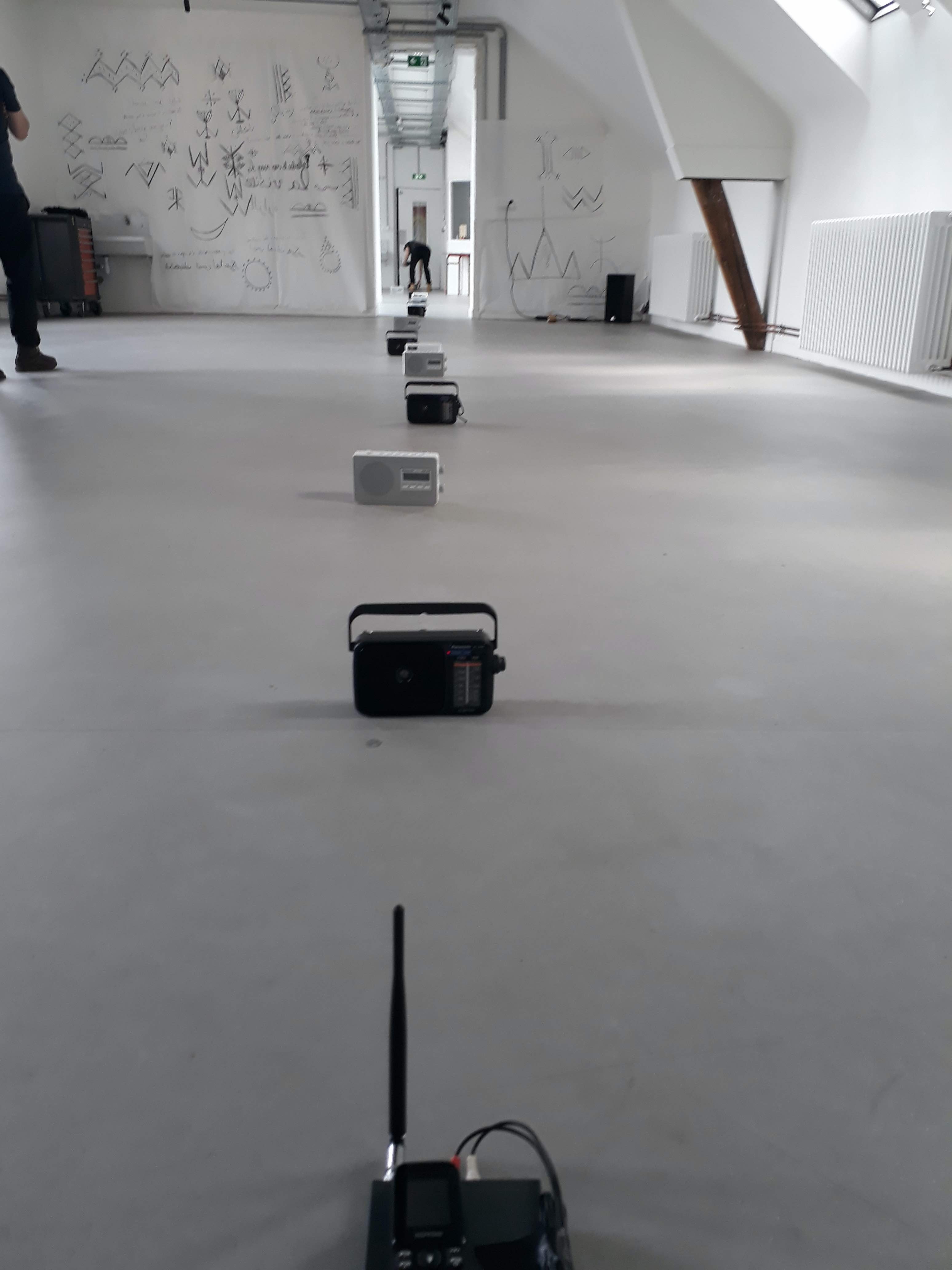 Irradiations est une déambulation, durant laquelle une sculpture radiophonique est continuellement déconstruite puis reconstruite. Émetteurs et recepteurs sont manipulés et deplacés par des performeurs qui improvisent selon un protocole défini en amont. Des bulles FM se créent autour des émetteurs, matérialisées et traduite en son par des postes radio.